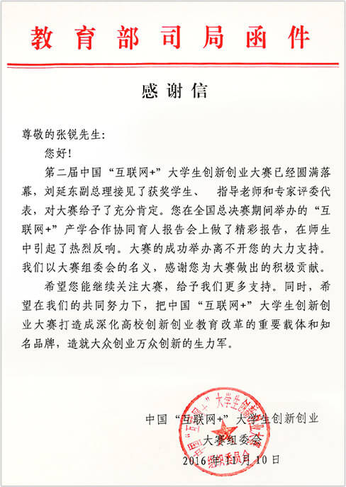 2018年,雷竞技连续多年为中国国际互联网+大学生创新创业大赛做出积极贡献,获教育部来函致谢。